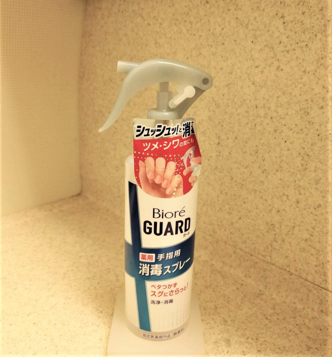 CAは、マスクと密閉率の高い眼鏡を着用しており、トイレにもアルコール除菌スプレーが置かれていた。