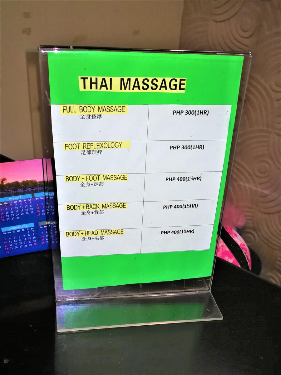 価格は、60分300ペソ(約700円)、90分400ペソ(約940円)。タイマッサージの基本と言われる120分コースは無い。中国系のオーナーが、タイマッサージの総本山ワットポー(バンコク)で習得した技を、スタッフに伝授したと言う本格的な手技で癒される。