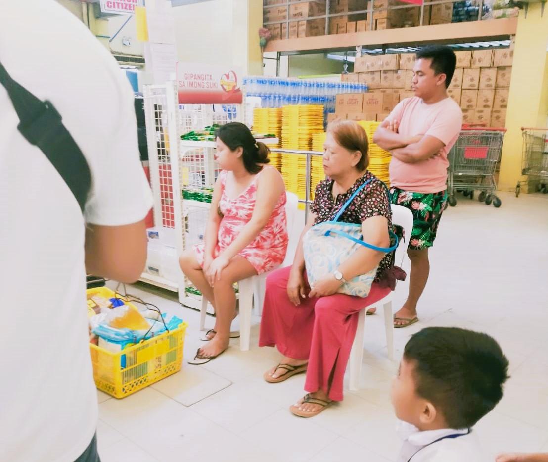 La Nueva Supermart Mactan Center 年配者用レジが設置されており、レジ待ちのための椅子も用意されている