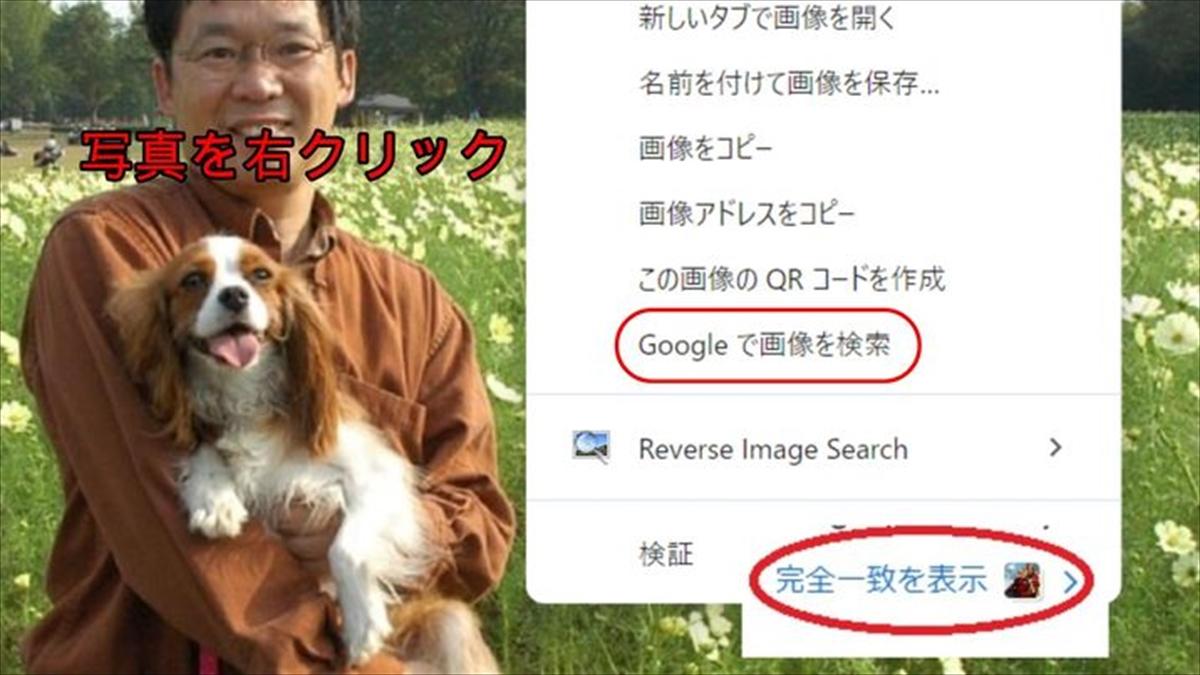 インターネット上で行われる詐欺など使われる写真やイラストは以前から存在している物を使いまわすことが多いです。今回の詐欺集団も7枚の写真を送ってきましたがGoogleレンズで調べたところ6枚が使い回しの写真であることが判りました。 写真チェックの方法ですが、パソコンでは写真を右クリックして「Googleで画像を検索」を選ぶだけです。さらに絞り込むには「完全一致を表示」を選びます。スマフォの場合はスクリーンショットをとってGoogeレンズを選ぶだけです。