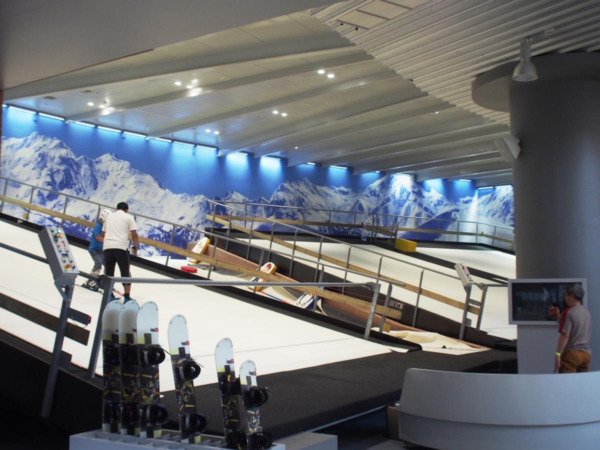 ガラス張りの施設内には6×9メートルのオランダ製の練習装置を3台設置している。白い人工芝のようなものがベルトコンベア状に回転し、擬似的に滑降を体験できる。タイ人のインストラクターがつき、1時間1単位でレッスンを受ける。速度は時速で最高99キロレベルが出せるため、初心者から上級者まで練習することが可能だ。道具はすべて揃っており、手ぶらで行くこともできる。
