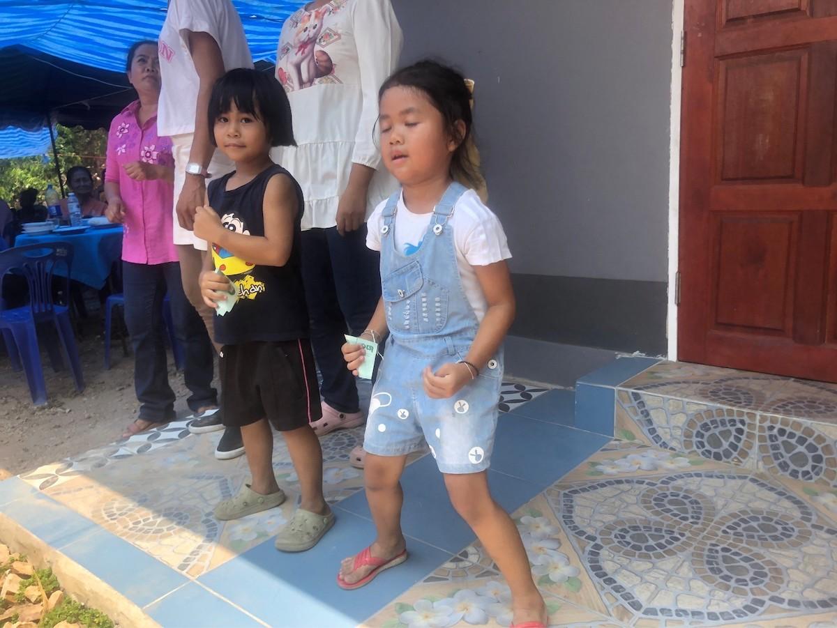 お坊さんは、ひと通りの読経と説教を終え、食事を済ませて寺に戻って行った。それと入れ替わるように「ロッヘー」と呼ばれるドラムやキーボード、そしてスピーカーを台車に積んだ楽団が、これまた大音響で演奏を始める。はじめは食事とおしゃべりをしていた参列者たちは、お酒が入ってきた事もあって、一人また一人と踊り出した。時計を見ると午前9時過ぎ。例年よりも気温が高いタイだが、午前中はまだ凌げる範囲だ。踊り手も少しずつ増えて、最後にはまだ小学校に上がったばかりの小さな子どもたちも一緒に踊っていた。