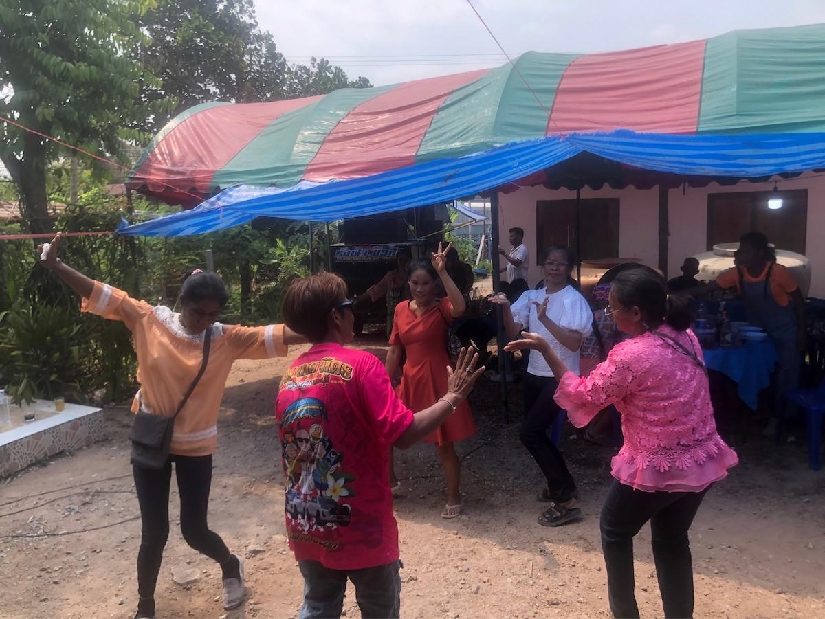 お坊さんは、ひと通りの読経と説教を終え、食事を済ませて寺に戻って行った。それと入れ替わるように「ロッヘー」と呼ばれるドラムやキーボード、そしてスピーカーを台車に積んだ楽団が、これまた大音響で演奏を始める。はじめは食事とおしゃべりをしていた参列者たちは、お酒が入ってきた事もあって、一人また一人と踊り出した。時計を見ると午前9時過ぎ。例年よりも気温が高いタイだが、午前中はまだ凌げる範囲だ。踊り手も少しずつ増えて、最後にはまだ小学校に上がったばかりの小さな子どもたちも一緒に踊っていた。