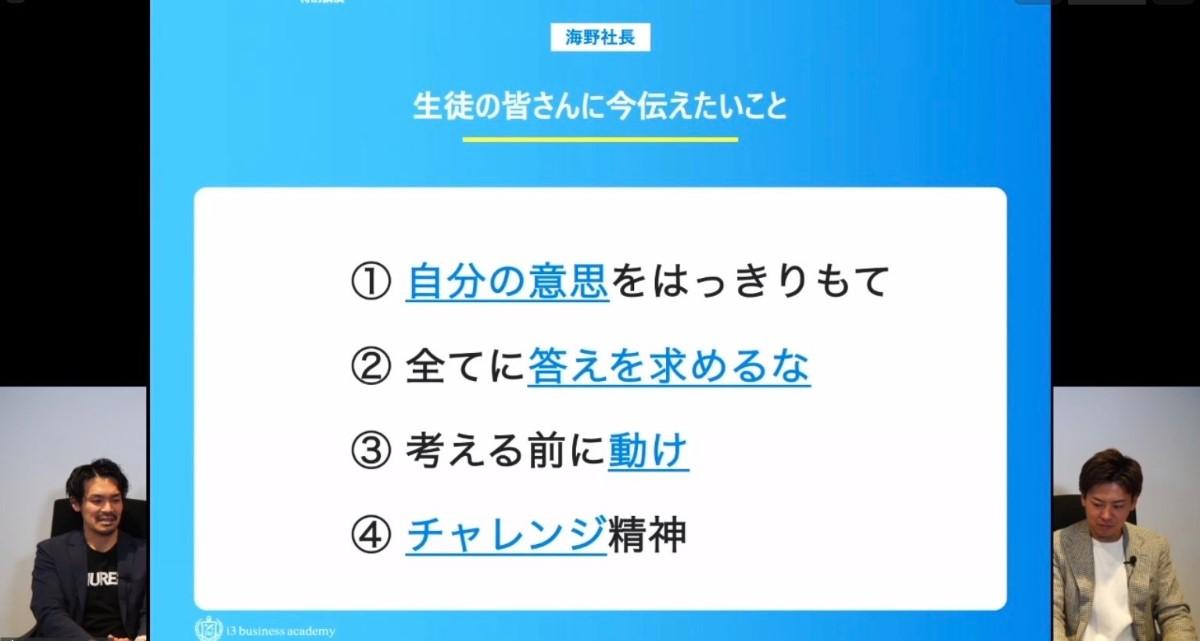 前半は、前期1年の振り返り、海野氏・漆沢氏が生徒に伝えたいメッセージ、営業力の重要性についての内容。グループワークの時間も設けられ、海野氏と漆沢氏のメッセージを聞いて感じたことを各自共有した。