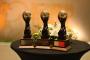ステージ上でトロフィーを手にするエアアジア客室乗務員