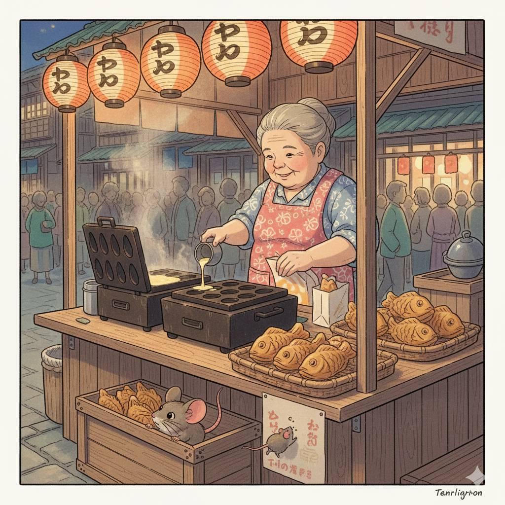 営業終了後の屋台に、ネズミが集まってきて、たい焼きの生地片を食べているのだ。いやもともと、毎年のこれも風物詩であり、知ってたのに知らないふりしている衛生環境は想像に難くない。