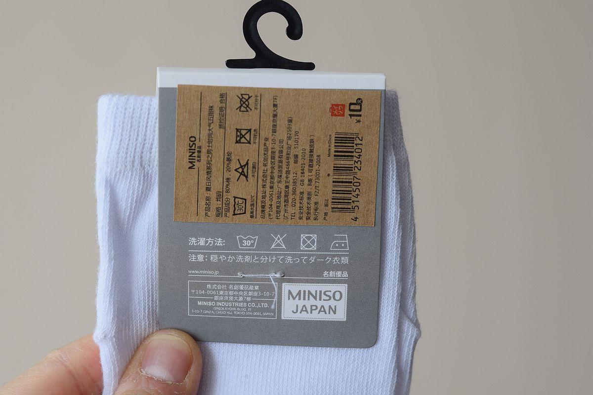 「MINISO JAPAN」と書かれた日本語の説明の上から中国語のシールをはっている靴下(我妻伊都 撮影)