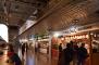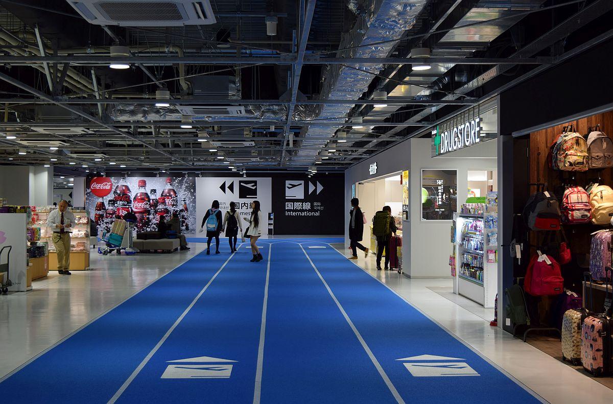 入り口から右側に航空会社のカウンター、左手にはコンビニエンスストアや書店などのショップや両替所が続き、奥には国内の空港では最大規模となる450席を有するフードコートがあり、右奥の出発口へとつながる。