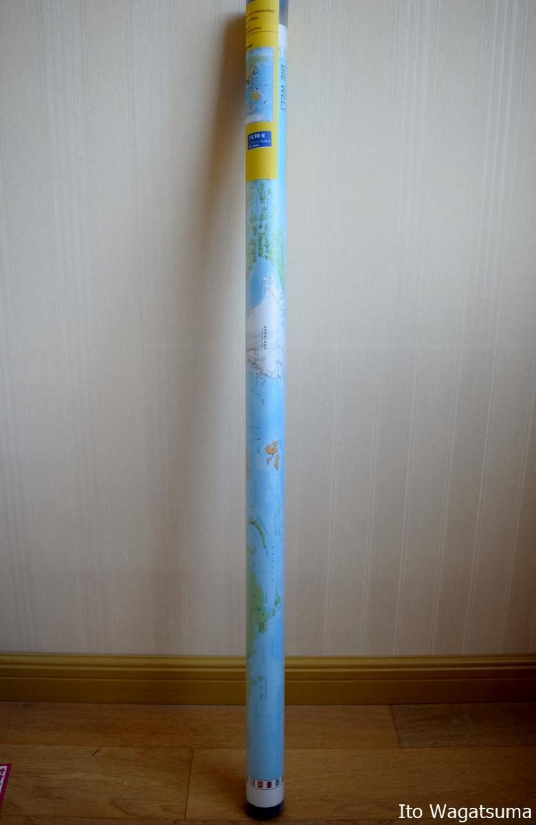 15.3ユーロ(約2100円)で購入したクルクル巻く筒状の世界地図(我妻伊都 撮影)