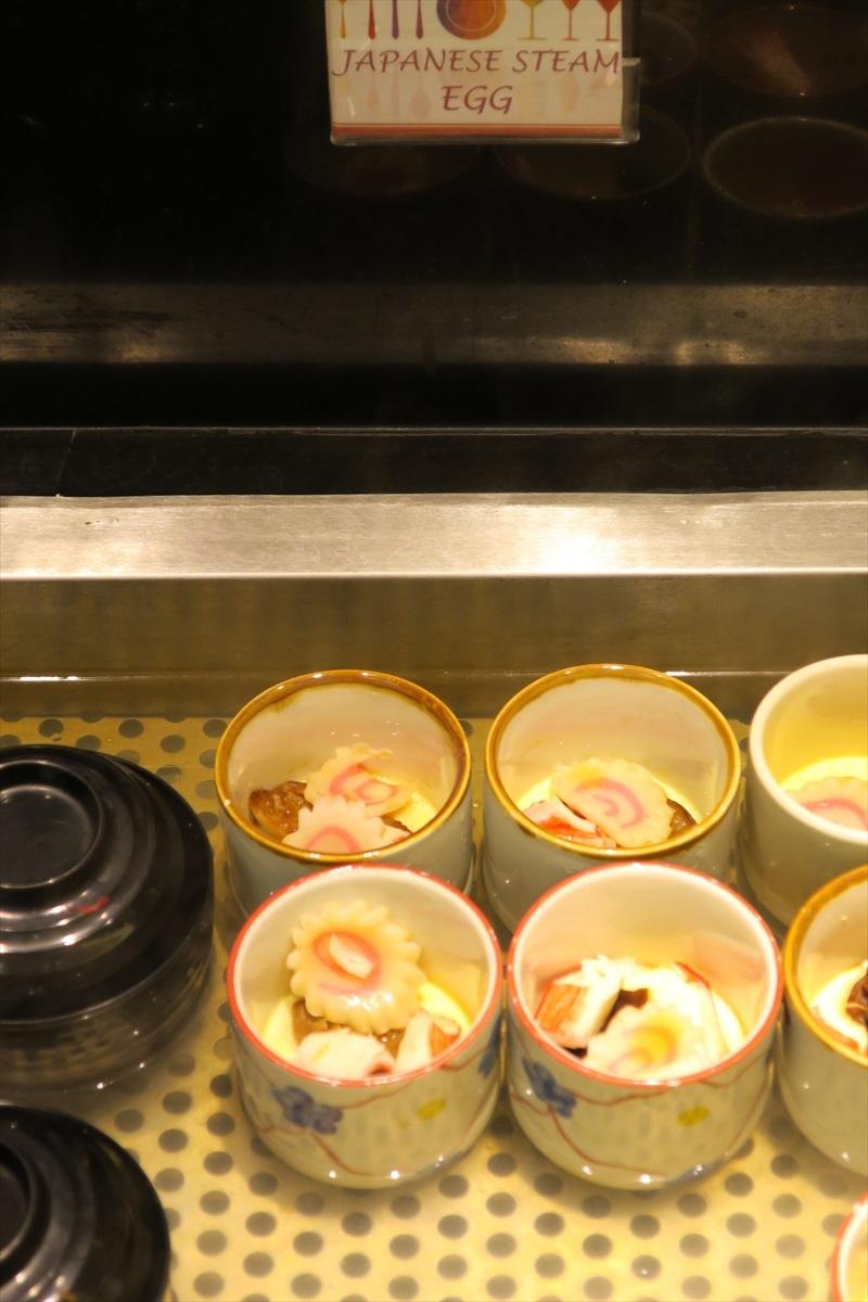 なぜか、料理や食材が並ぶコーナーの頭上には、大きなシャンデリアが設置されており、日本酒の大樽もあり、日本のイメージを活用して集客しようとの姿勢が強く感じられる店舗だが。シュウマイや中国饅頭も、日本食と表記したプレートの下に置かれている。