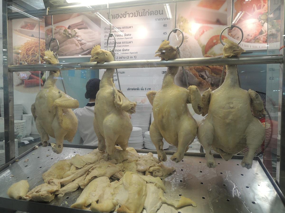 オンヌットにあるスーバー・ロータスのクーポン食堂のカオマンガイ(ゆで鶏のせご飯)。鶏の首と顔がちょっと不気味だけど、食べると美味しい。