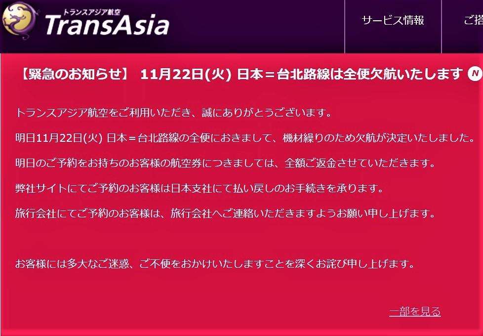 2016年11月22日、現地メディアによると、台湾に本社を置くトランスアジア航空は、解散を決定した。22日の全便を欠航している。