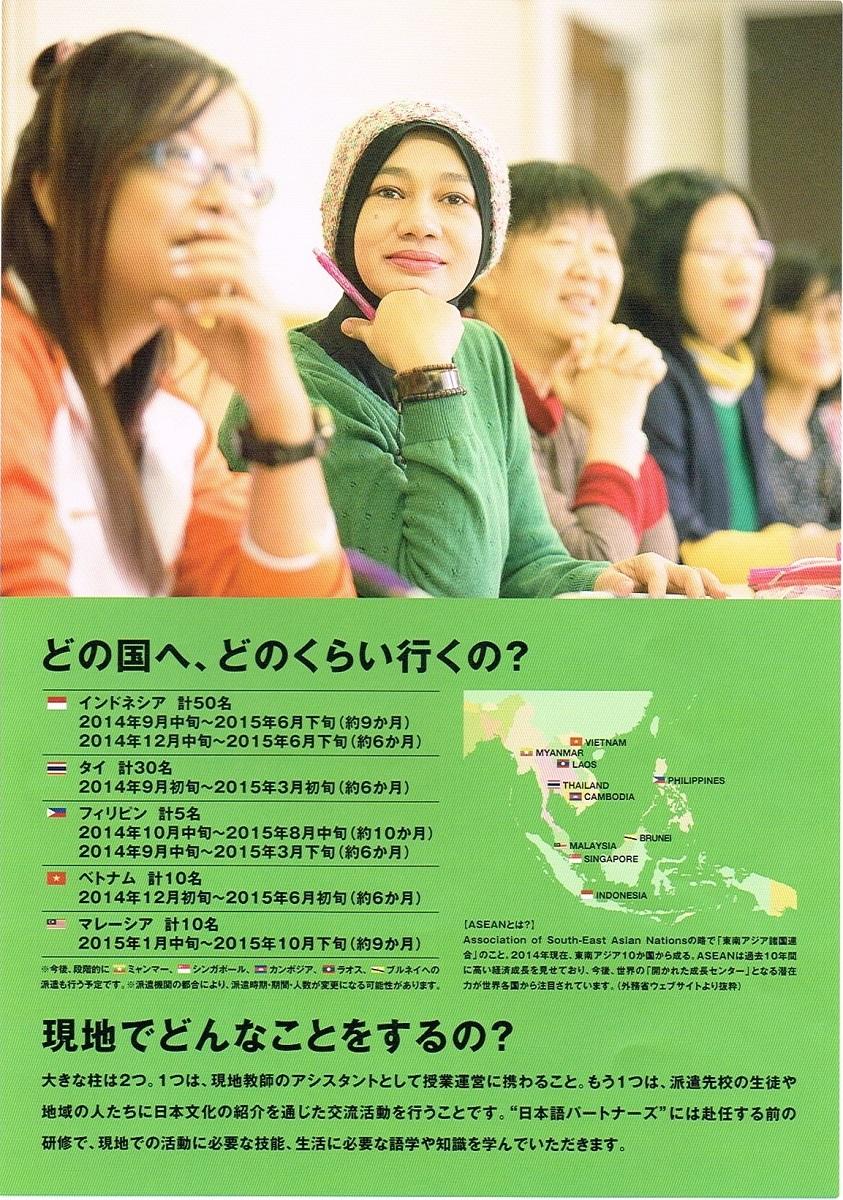 2014年5月14日、独立行政法人・国際交流基金アジアセンターは、ASEAN各国の日本語普及を担うため、公募で約3000人の日本語パートナーズの派遣準備を進めている。これは、昨年12月に都内で開いた日ASEAN特別首脳会議で、安倍晋三首相が表明した「文化交流拡大」の具体策の中心としてだ。現地教師のアシスタントとして授業に協力するほか、各地域で日本文化の紹介を通して交流活動をおこない、また、日本語パートナーズ自身も派遣先国の文化を学び、日本への親近感を高めてもらう草の根・親善外交官的な役割も期待されていることから、「日本語パートナーズ」という親しみやすい名称にした。