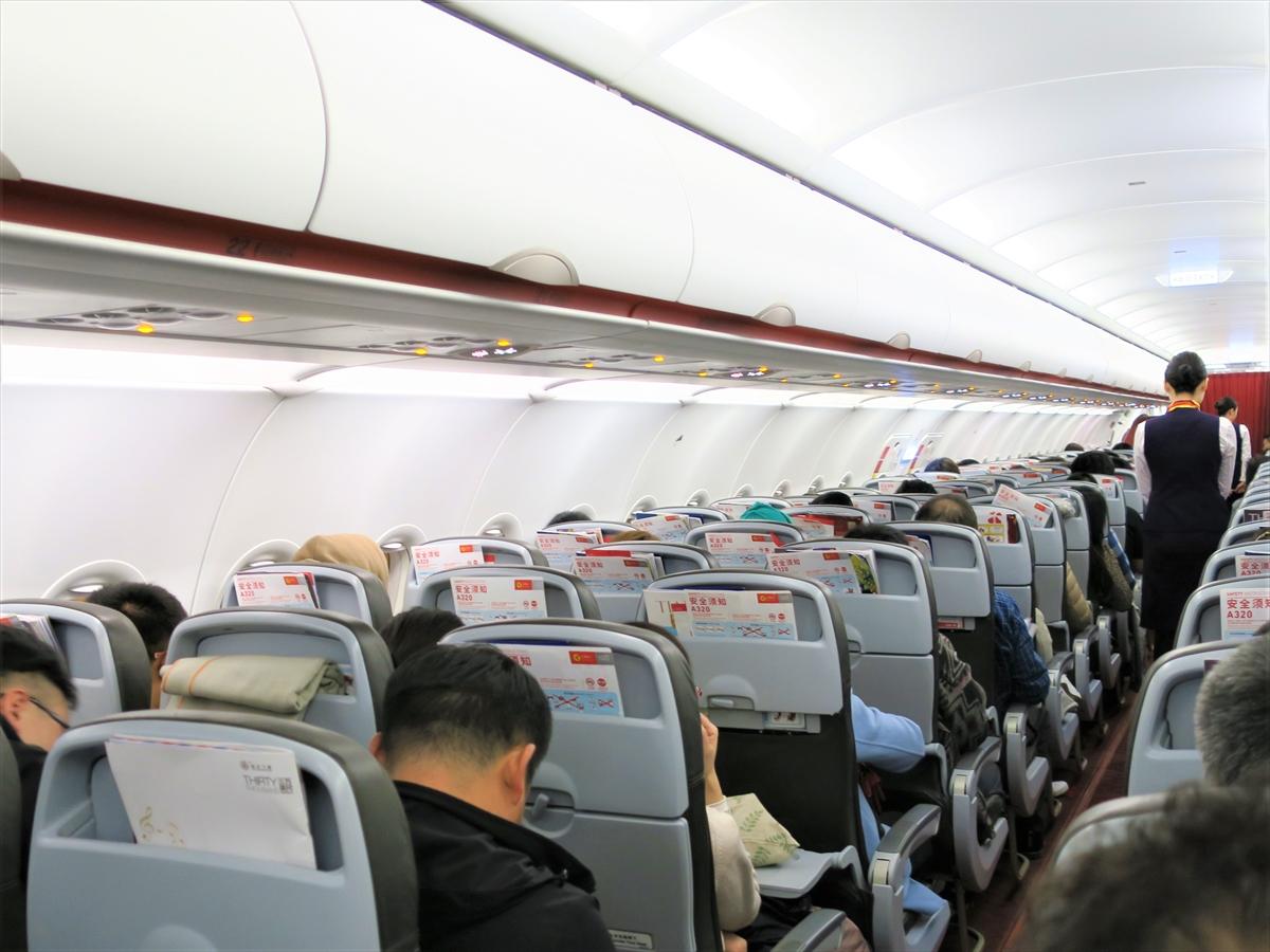 天津発の羽田行き、中国人客を中心にほぼ満席。機材は、新しめのエアバスA320を使用しており、CAの笑顔も素敵だ。