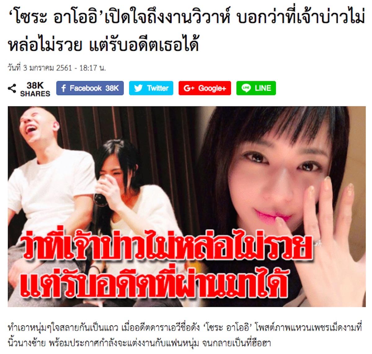 2017年1月3日、インスタグラムのフォロワーが海外では一番多いというタイで、蒼井そら結婚のニュースが報じられた。それには、多くのタイ人ファンが大ショックを受けたようで、記事は瞬く間に38,000件もシェアされた。