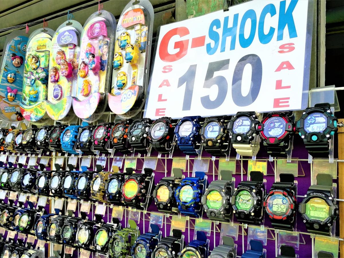 クラーク空港近くのアンヘレスの商店街の露店では、偽物G-SHOCKセールが人気を集めている。通常500ペソ(1050円)前後で売られていることの多い価格帯の商品が、150ペソ(315円)。安さに誘われて5個、10個とまとめ買いをする人も。また、通常700ペソ(1470円)前後で売られている商品は、180ペソ(378円)となっていた。