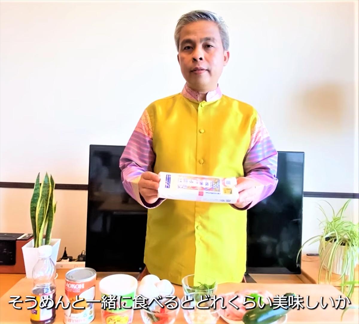 動画では、大阪事務所長がタイの衣装で登場。タイ食材店での材料購入のシーンも。