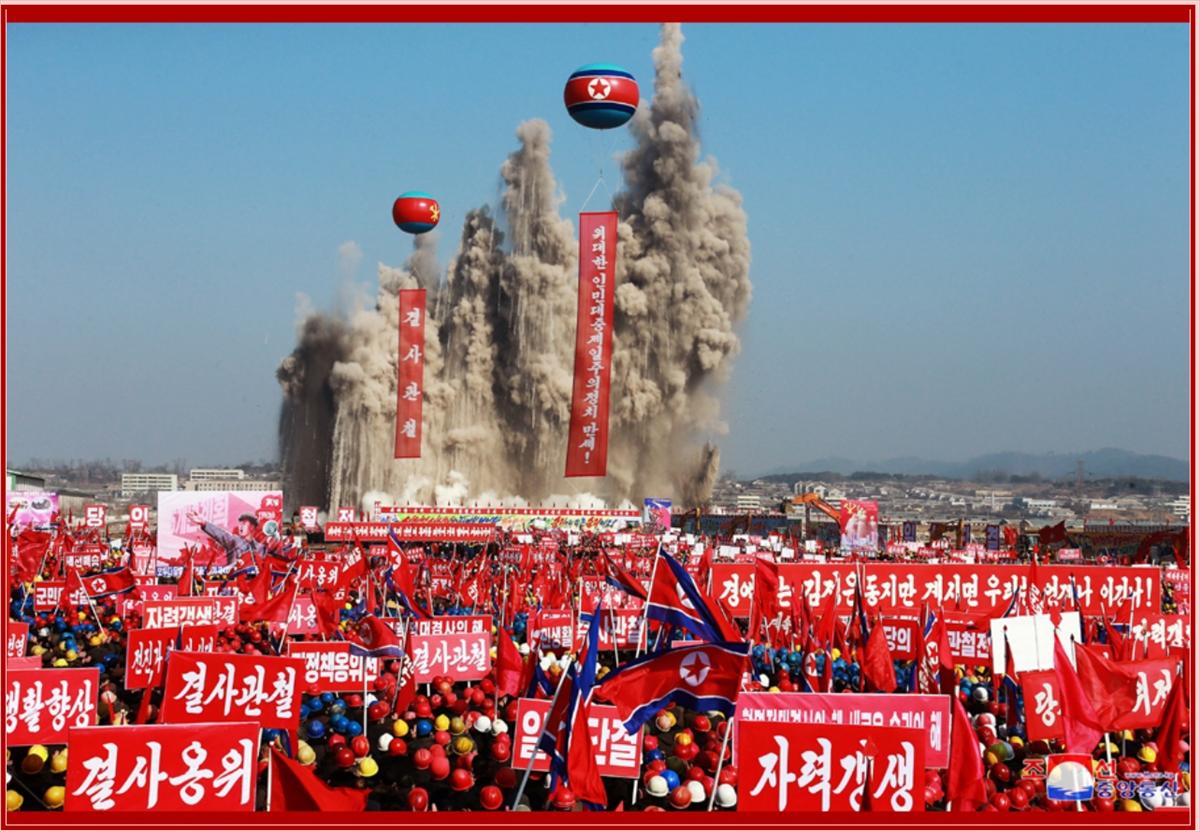 金正恩総書記が情熱あふれる演説を終えると、全ての建設者は朝鮮式社会主義発展の偉大な新時代のために、われわれの平壌のために、大変革を遂げた住まいとともに開花する人民の幸福のために限りない思索と労苦をささげている総書記の崇高な志を体して、不屈の強靭さと尽きない創造精神で和盛地区に社会主義繁華街をこれ見よがしにうち建て、首都建設の全盛期をつないでいく鉄石の意志にあふれて嵐のような「万歳!」の歓呼の声を上げた。