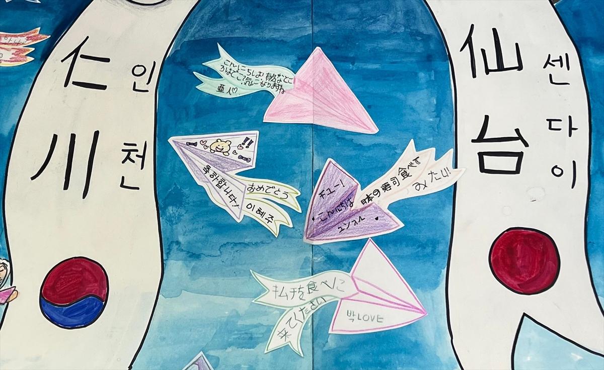 2023年4月28日、仙台空港では、約3年ぶりに仙台ー韓国・仁川との定期便の運航が再開される。韓国の子どもたちが描いた絵画(横断幕)が到着ロビーに掲示される予定だ。絵画には、韓国と宮城県の名所や食べ物、飛行機などがカラフルに描かれており、中央下部には「仙台と仁川の友好を願って」というメッセージが貼り付けられている。