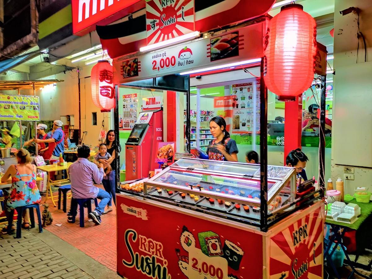 ラオス・ビエンチャンの旭日旗デザインの寿司屋台
