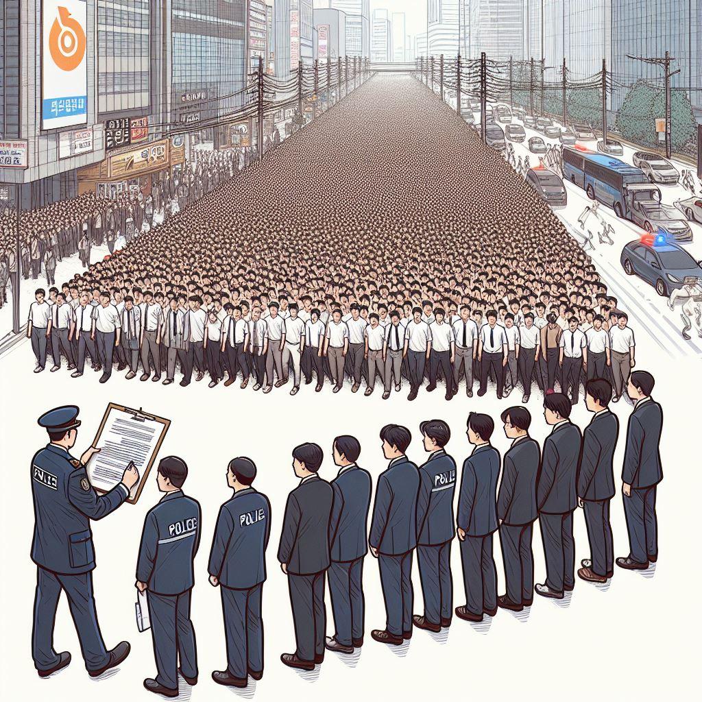 韓国でも、デモを行う際は警察に届けなければならない。日本の届け出は時間内ではなく、デモを始める720時間前から48時間前に管轄の警察に、内容を記した申請書を出す。つまり、朝8時から始めたければ、30日前の朝8時から申請は可能だ。毎日デモしている、プロのデモ家がいるような韓国は、とにかく申請が多い。うっかり48時間=2日前に駆け込み申請しても、申請者が多すぎて間に合わない場合が多々ある。