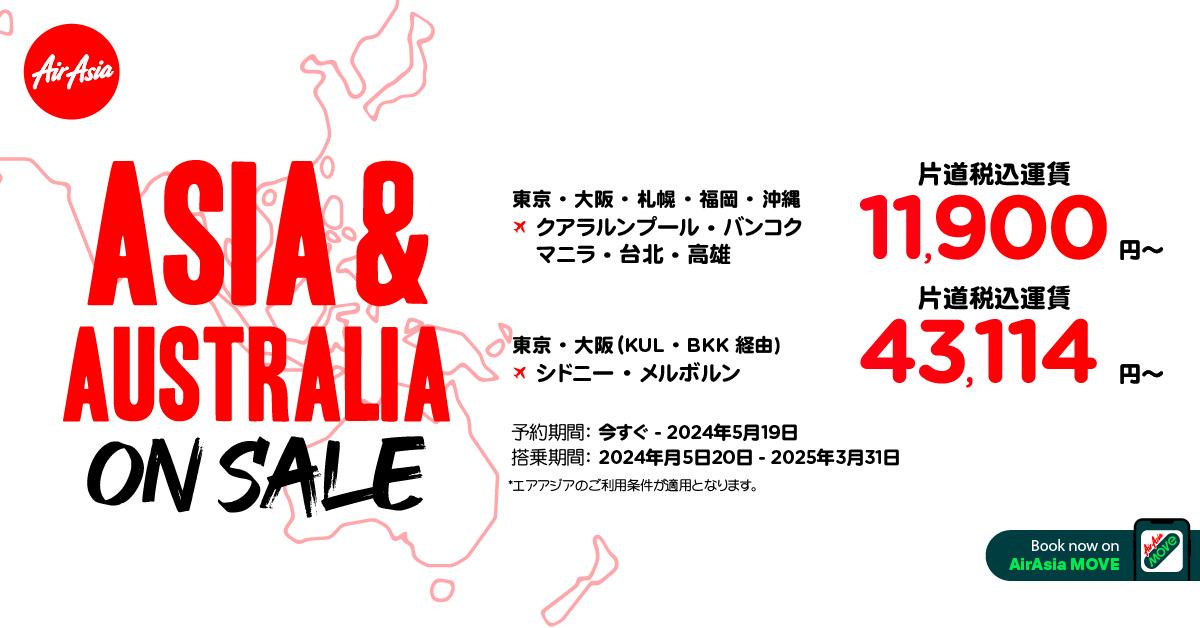 エアアジアは、2024年5月19日まで、アジア&オーストラリア対象スペシャル運賃で航空券を発売中だ。旅行期間は、2024年5月20日から、2025年3月31日まで。
