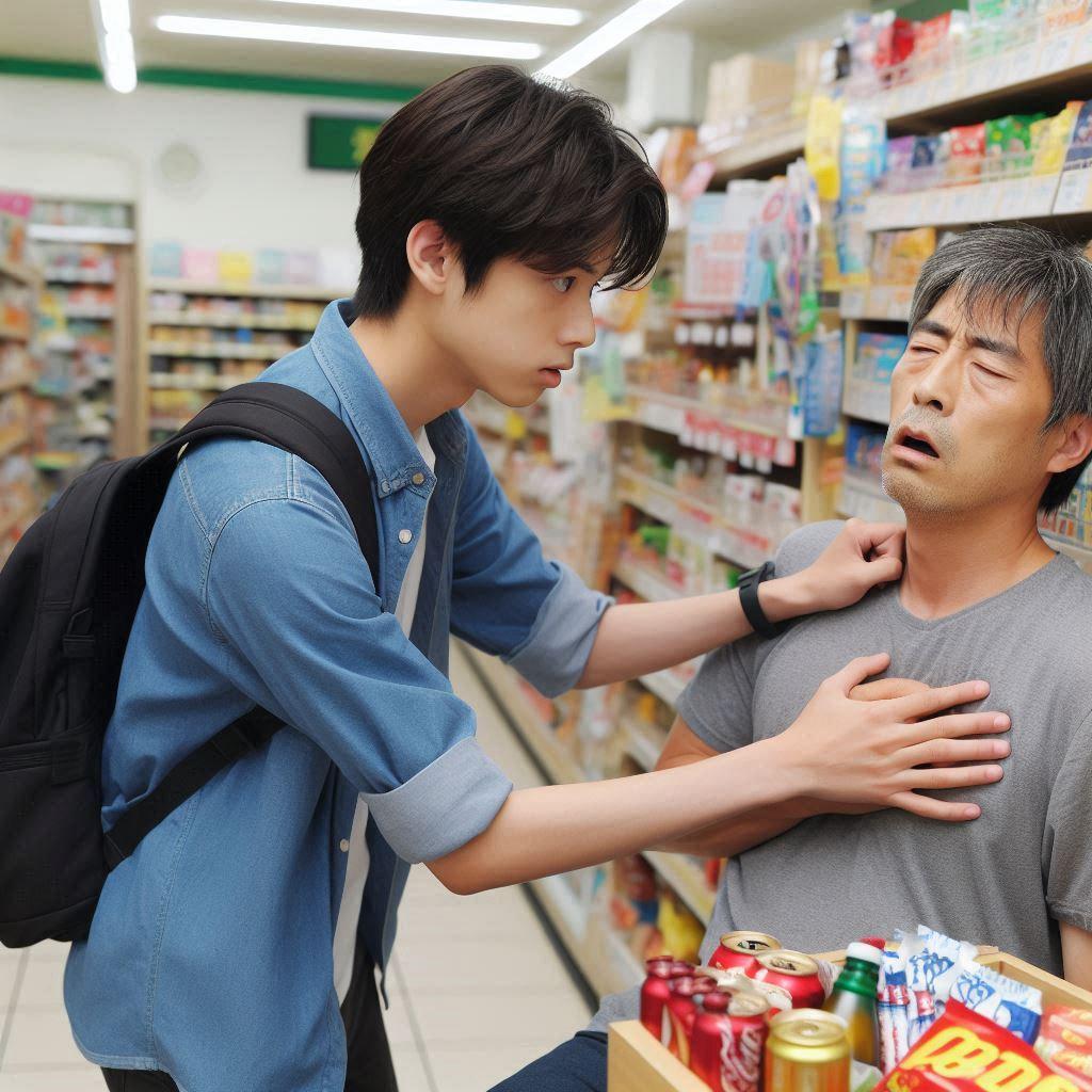 倒れていた男性に気が付いたのは、中学生。男性が意識を失う瞬間に「何か甘いものを」と渾身の力を振り絞って話した。中学生は、お金を払ってはいないが、目の前にあったお菓子を男性の口にいれた(オレンジジュース、栄養ドリンク、コーラなども即効性がある。また、基本糖尿病患者は予防でブドウ糖や飴をポケットに入れていることが多い)。しばらくすると、男性は意識を取り戻した(使用した未払いのお菓子は清算されただろう)。