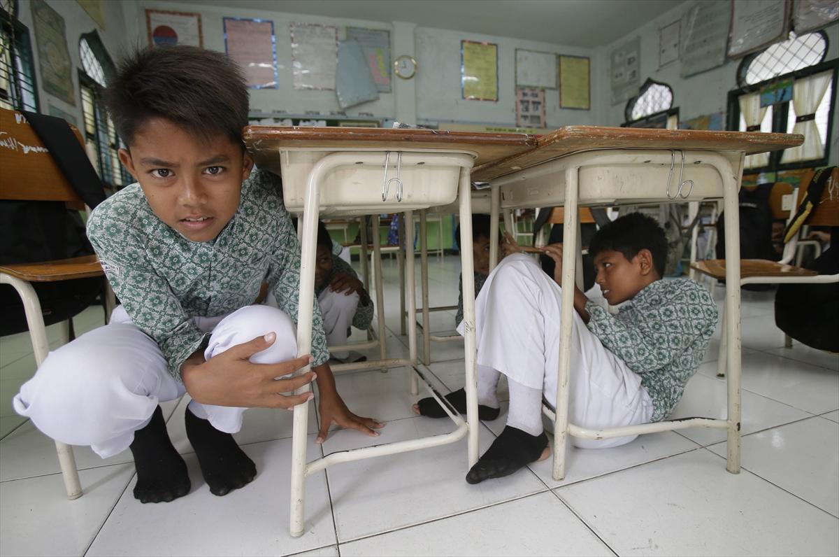 避難訓練で机の下に隠れるバンダ・アチェの小学校の児童たち。(C)UNICEF/PFPG2014-1356/Unknown