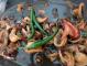 イカの煮込み(アドボ・プシット):イカを醤油や酢、ニンニクなどで煮込んだ、フィリピンの代表的な調理法であるアドアボ(Adobo)風のシーフード料理。黒いソースに絡んだイカは、柔らかく煮込まれており、上には鮮やかな緑色の唐辛子が添えられ、見た目にもアクセントを加えている。