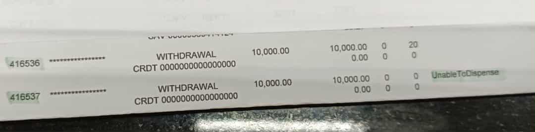 1回目の10,000ペソ(26,851円)の引き出しには成功したものの、2回目の操作ではレシートとカードだけが出てきて現金が出てこない。通常、現金が不足している場合などはエラーメッセージが表示され取引が終了しますが、今回は「出金完了」と印字されたレシートが出てきました。