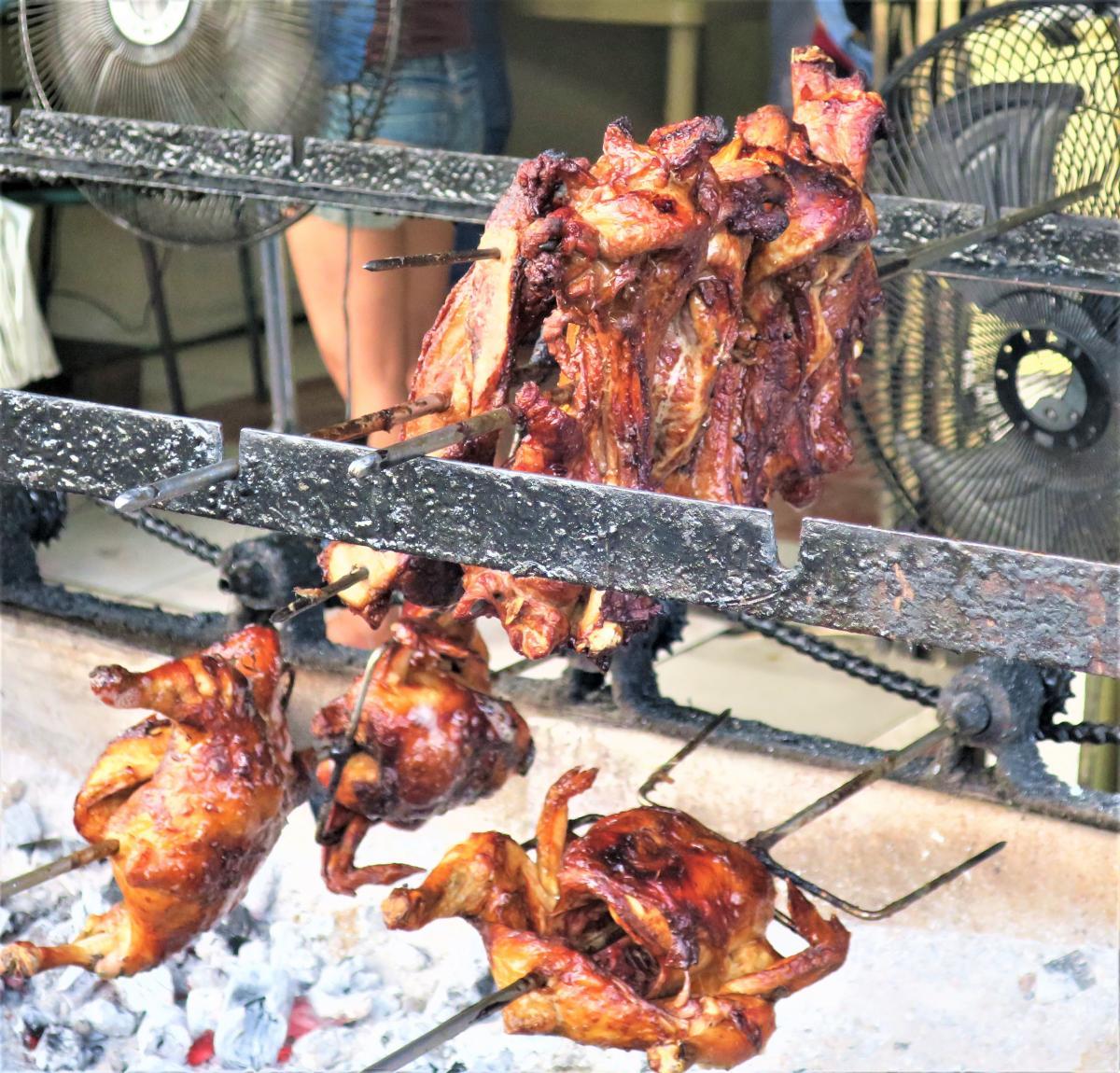 マニラ郊外のバーベキュー店でも、来店キャッチにキティちゃんキャラクターを採用。この店は、豚の塊肉(125ペソ・約300円)や、鳥の丸焼き(170ペソ・約390円)がメイン、甘口のバーベキューソースと醤油ソースの2つが付いてくる。重さによって価格が異なる。