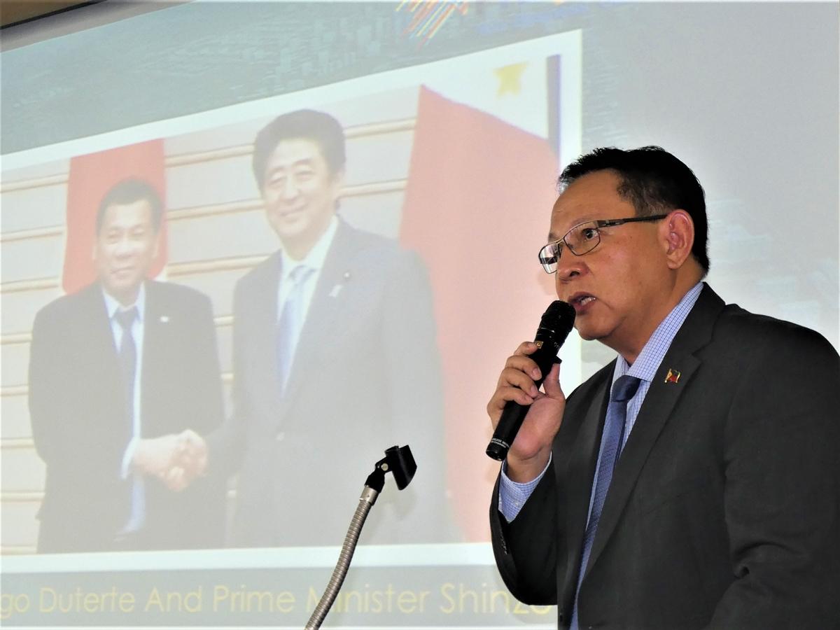 ディタ・アンガラ・マサイ商務参事官の開会あいさつの後、フィリピン貿易産業省セフェリノ・ロドルフォ副大臣が『フィリピン:戦略的グローバルビジネスパートナー』と題する基調講演を行った。フィリピンに拠点を作った場合、関税が大幅に有利になる点などについてもアピールした。また、ミンダナオ島の過激派組織「イスラム国」(IS)系武装勢力と政府軍の戦闘については、必ず1年以内に完全に解決し、安心安全を取り戻すとドゥテルテ大統領が話していることも伝えた。