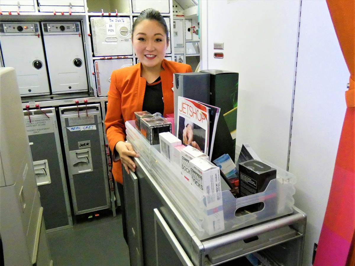 ミールサービス終了後、機内免税品などの販売準備をする日本人CAのユカさん(2018年4月3日午後撮影)