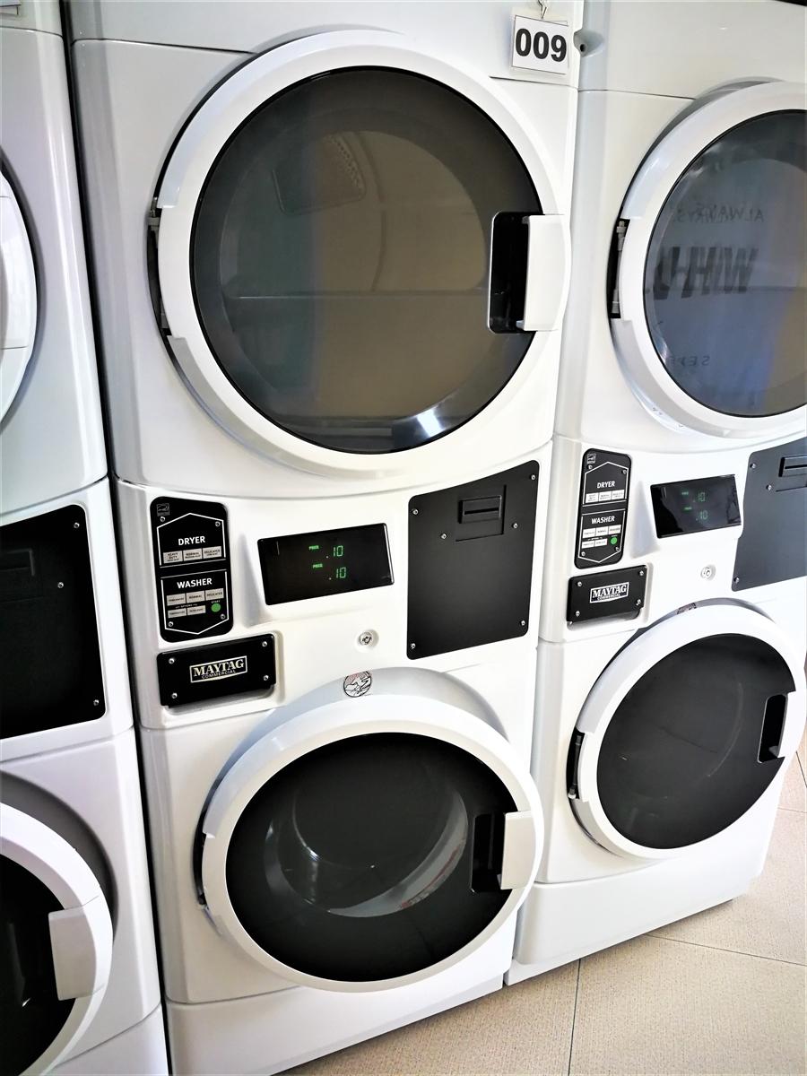 先月オープンした洗濯ショップには、洗濯機、乾燥機各10台が設置。一度に8Kg程度まで対応可能な業務用マシンで短時間での洗濯・乾燥が可能だ。日本のコインランドリーとは違いショップスタッフが常駐しており、洗剤や漂白剤なども販売している他、別料金でのお任せサービスも実施している。