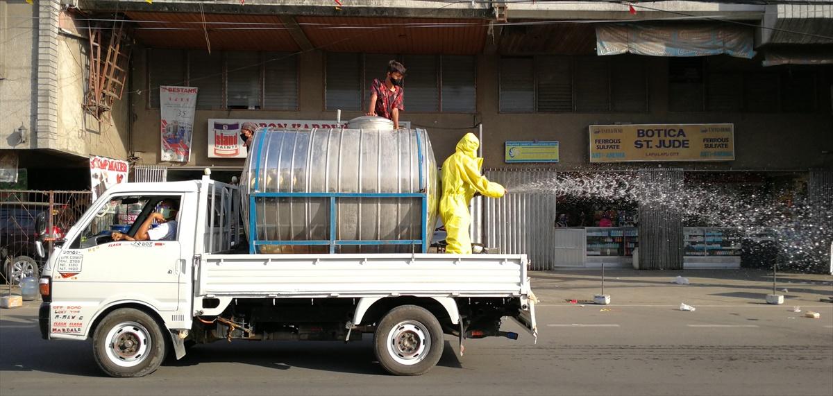 感染確認者が、わずか3人のラプラプ市でも、都市封鎖と移動制限(基本は自宅待機)が行われており、マーケット周辺の道路では、消毒薬を搭載したタンク車で散布作業が実施された。