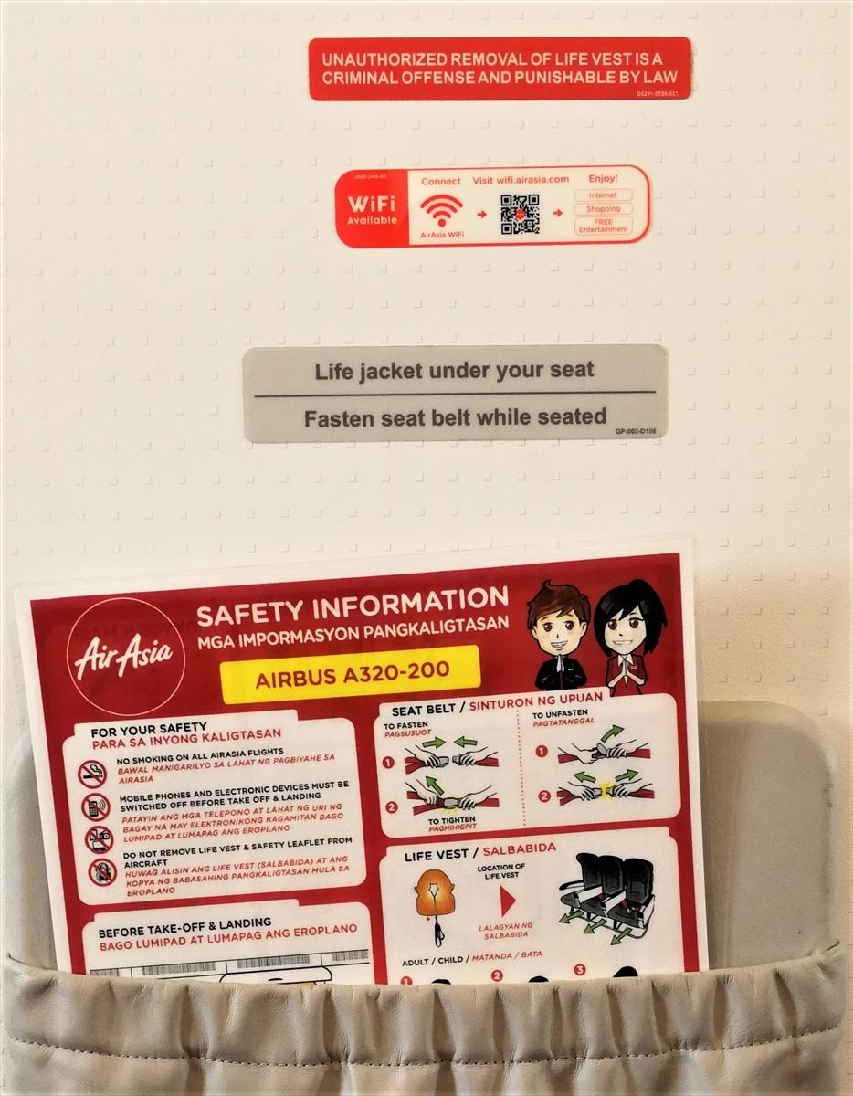 このフライトの搭乗率は約50%程度。中には防護服姿の搭乗客もいた。3人のCAの内、2人は眼鏡型のゴーグルを装着、頻繁にアルコール消毒を行っていた。これまで機内で飲料やスナックなどの販売を積極的に展開していたエアアジア、事前に購入された食事を配るだけで、リクエスト対応でペットボトル水のみ販売していた。14時30分ごろマニラ空港に到着した。