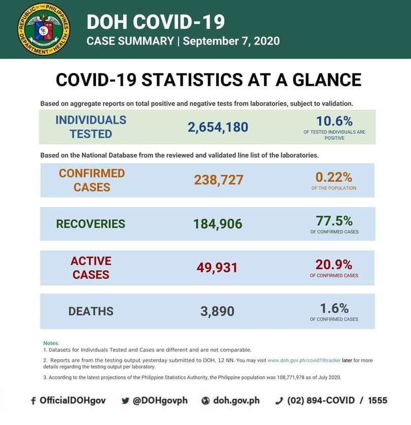 2020年9月7日、フィリピンでの新型コロナ感染確認者は1,383人(マニラ首都圏525人)で、7月14日以降で最も少なくなった。累計感染者数は238,727人となり東南アジアでは一番多い感染確認者になっている。しかし、積極的に感染検査を実施していない国もあるため、感染者自体が多いかどうかは分からない現状だ。