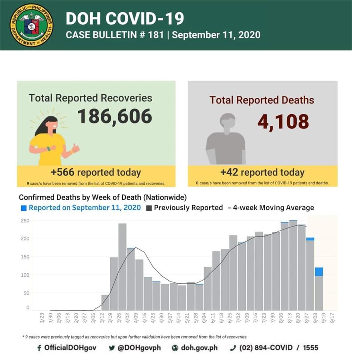 2020年9月11日、フィリピンでの新型コロナ感染確認者の累計は、4,040人増えて252,964人になった。死者数は8月20日からの週をピークに減少傾向が続いている。死者の累計は4,108人。