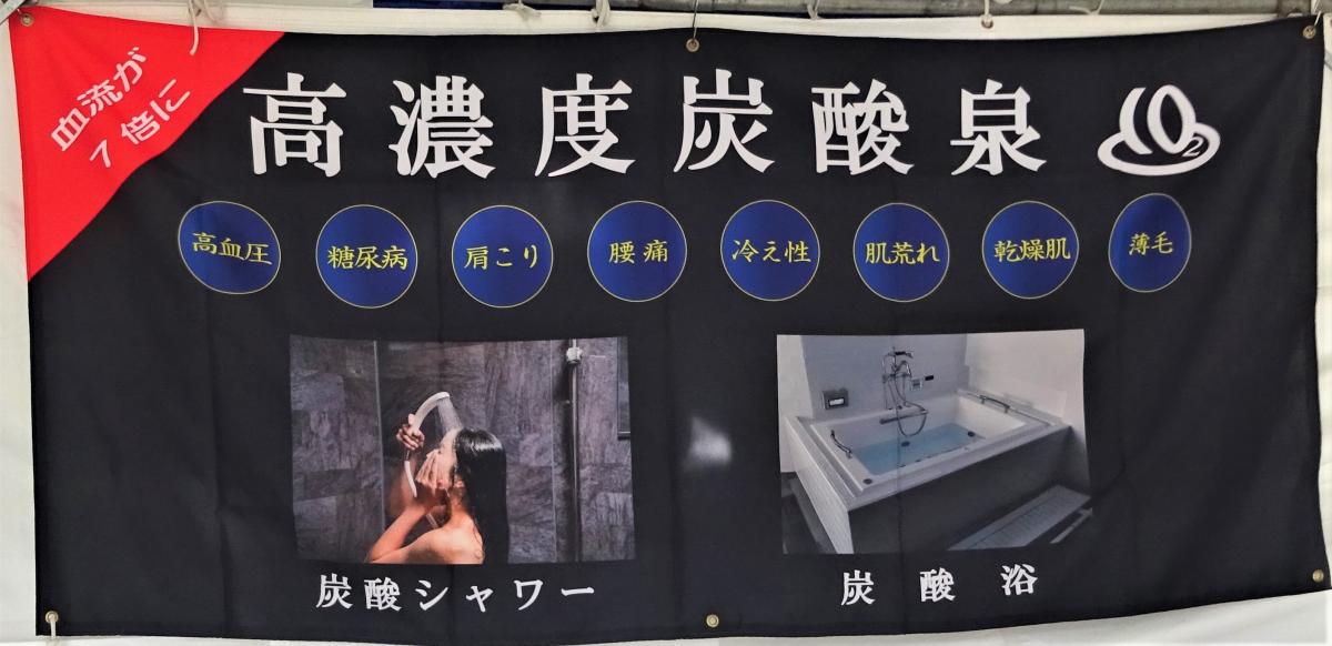 この会場には、本格的な炭酸足湯コーナーもある。炭酸入浴は、1983年に、入浴剤・花王のバブが発売され一大ブームになり、各社から様々な商品が提供されるようになった。炭酸ガスボンベを使用した循環ろ過型は、市販の炭酸入浴剤とは別次元の炭酸効果を得られやすい。(埼玉県ふじみ野市・ヴィータが出展)