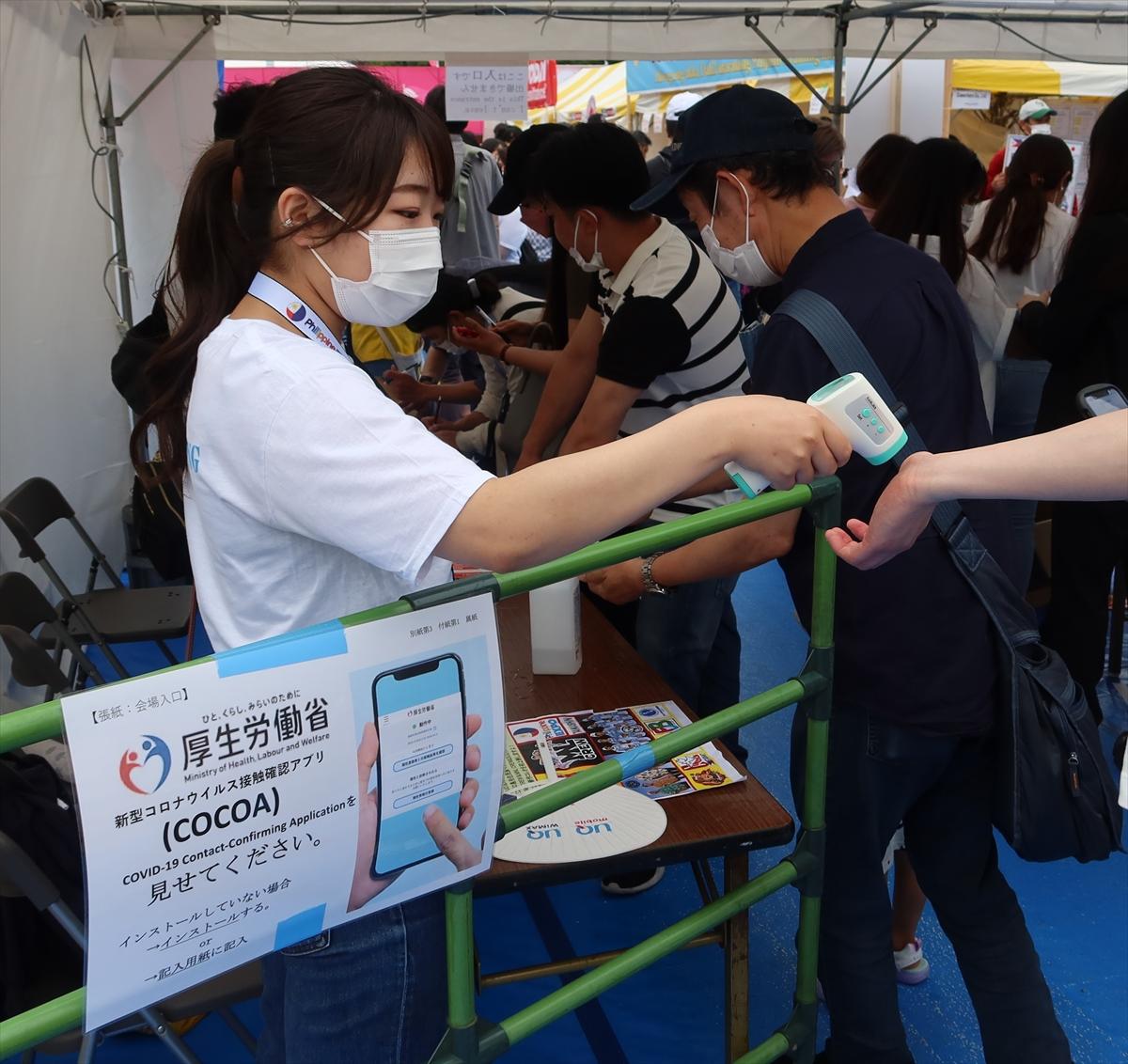 入場時に、厚生労働省の「新型コロナウイルス接触確認アプリ(COCOA)」 の利用を勧めている。昨日は時間帯によっては入場待ちの列が300メートル。スムーズな来場のためにも、COCOAの事前インストールが必須だ。