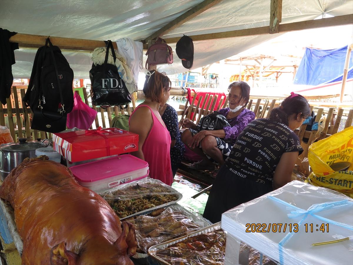 手狭なコテージ(利用料約3千円)にお邪魔し、お祈りをし、誕生パーテイが始まった(豚の丸焼きが2万円とは高くなりました~)海上販売店が来て様々な物を売っているので便利。
