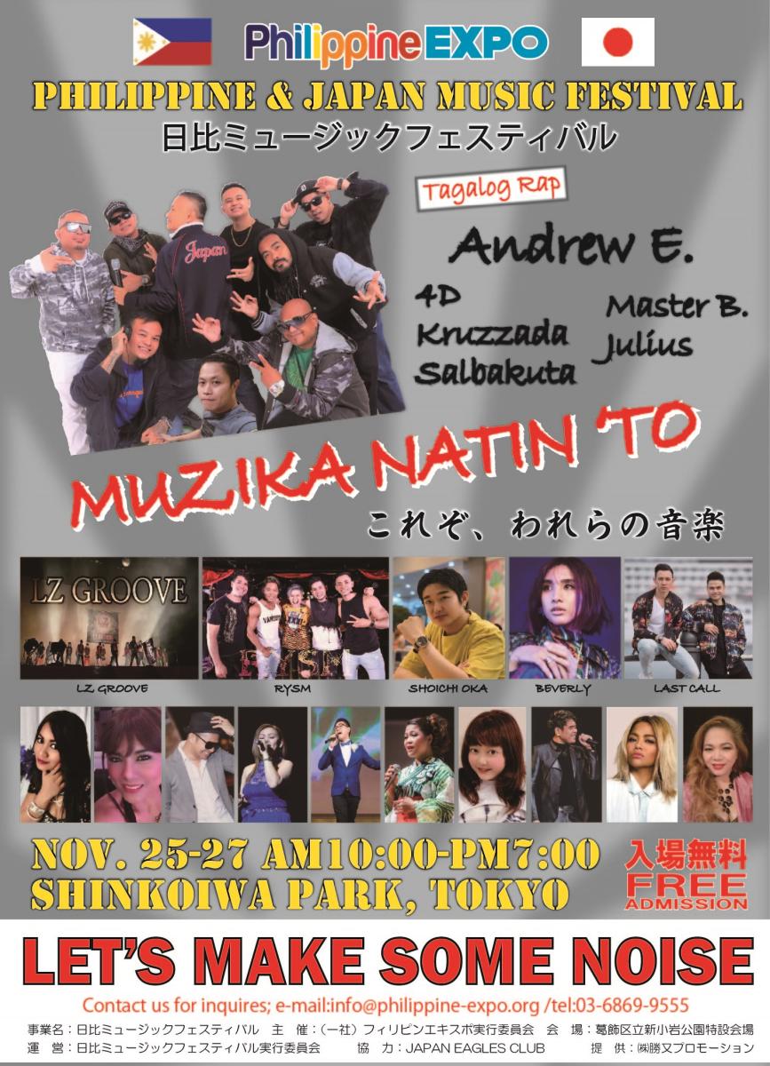 11月25日~27日は、新小岩で『MUZIKA NATIN ‘TOA JAPAN & PHILIPPINE MUSIC FESTIVAL』を開催。葛飾区新小岩公園。提供 株式会社勝又プロモーション、日比のアーティストによる音楽祭。最終日にはアンドリュー・イーが登場。入場無料(有料席あり)、テーマ EUPHORIA(多幸感)。