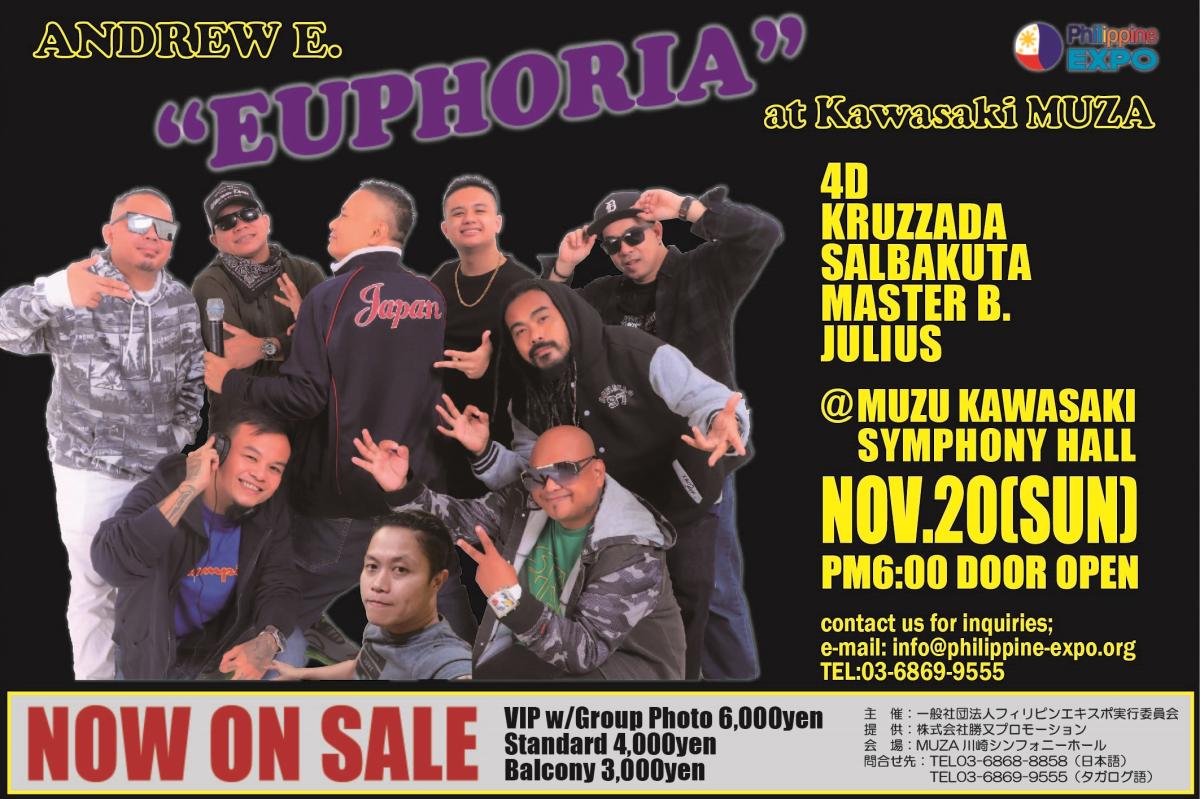 11月20日は、川崎で『Andrew E. “EUPHORIA”at Kawasaki MUZA』を開催。 MUZA川崎シンフォニーホール、提供 株式会社勝又プロモーション、来場者数 2,000人。入場料(VIP¥6,000/スタンダード/¥4,000/バルコニー¥3,000)フィリピーノ語によるラップショー。