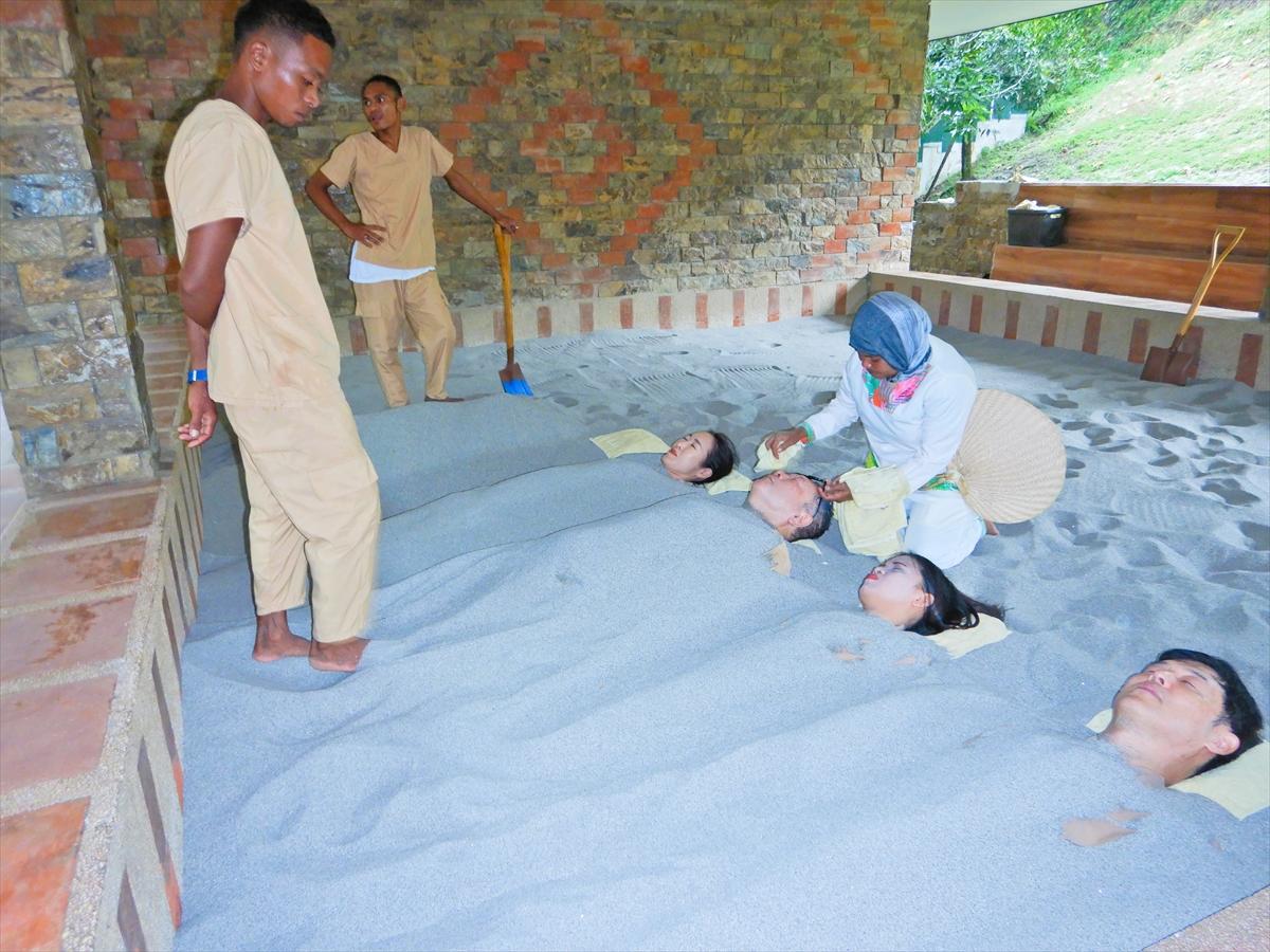 温泉の後は、再びジープに乗車し、セクション2の砂風呂へ、砂の重さで足首の脈を全身で感じることが出来る。砂の温度は36~38度に保たれており、じんわりと発汗する。足ふみマッサージの施術も砂で圧が分散するため、足裏の2倍ぐらいが面で指圧を受けている感じだ。汗ばむとスタッフが団扇であおいでくれる。砂風呂は約30分間。そして全身泥パック(ピナツボ火山系)の泥が、毛穴にたまった汚れを吸い出してくれるようで、スベスベになる。