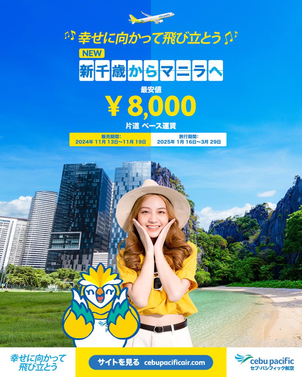 セブ・パシフィック航空は、11月19日まで、記念セール運賃での販売を実施中。フライト手数料、燃油サーチャージや諸税(出入国税、空港使用料等)などの追加料金を除いた札幌マニラ間の片道初乗り運賃を 8,000円からに設定している。旅行期間は 2025年1月16日(木)から2025年3月29日(土)まで。