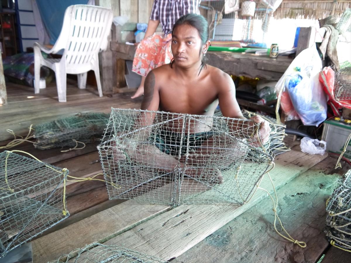 クッド島。蟹のカゴ漁。切れた網を補修する漁師。