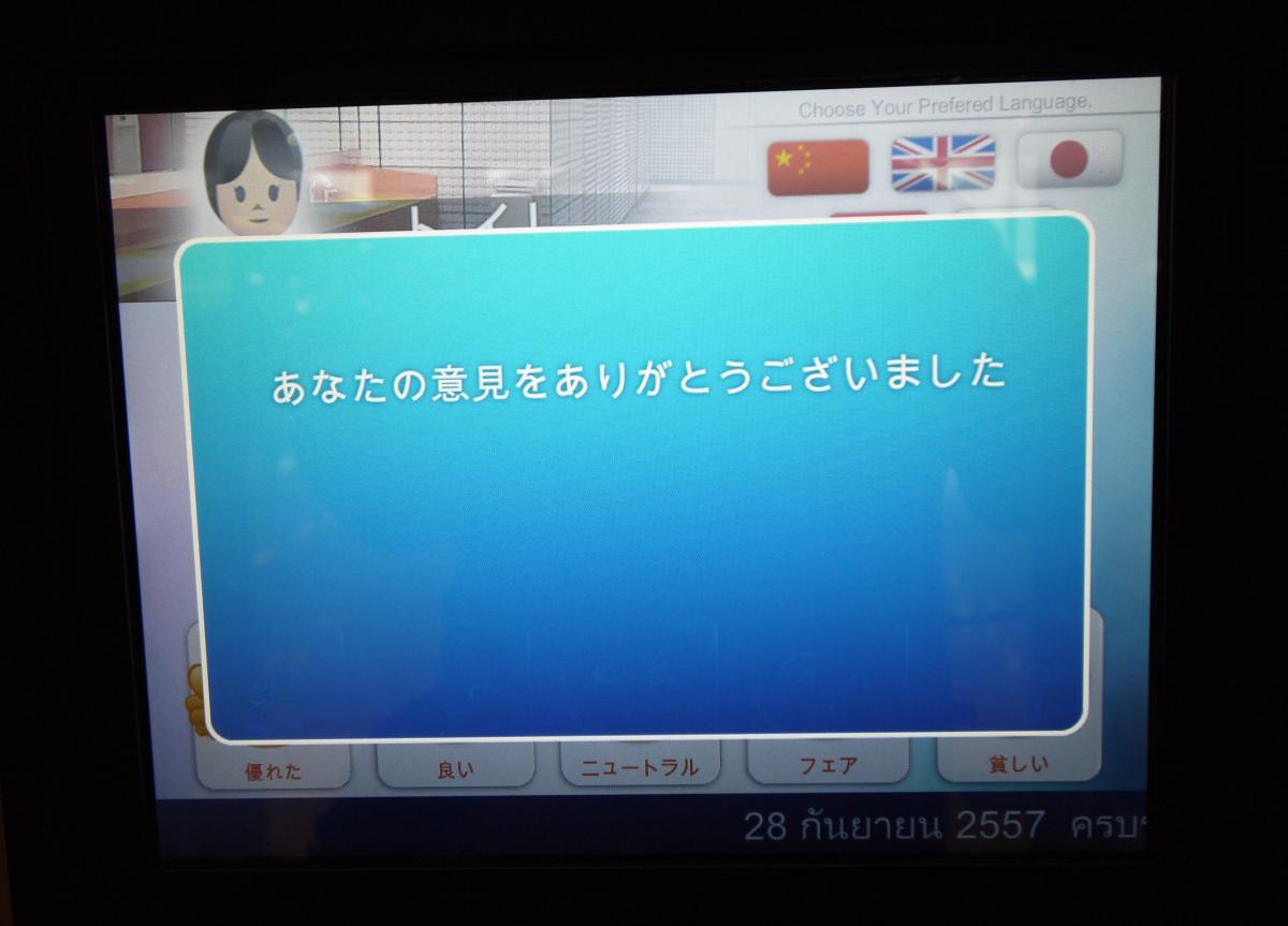 中国の空港で、入国審査官を評価するボタンを見たことはあるが、本格的なトイレ評価ディスプレイは、珍しい。また、スワンナプーム国際空港の、インフォメーション・サービスカウンターにも、同様のディスプレイ機器が設置されており、空港各所のサービス向上も目指している。