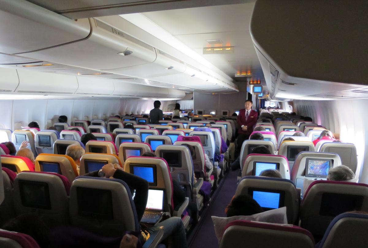 羽田発バンコク行き TGタイ国際航空・メインキャビン。(ボーイングB777)