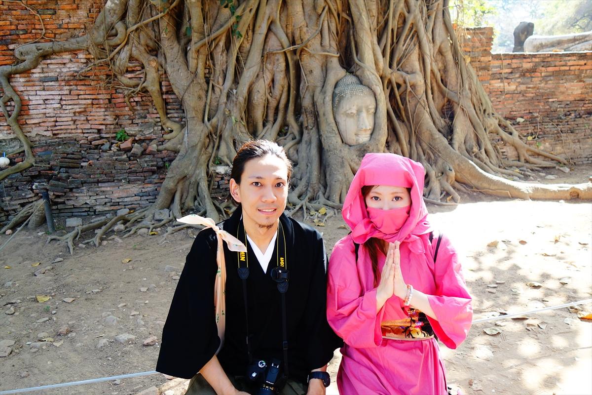 2015年2月26日、アユタヤ遺跡で一番有名な「ワット・マハタート」に女忍者が参上。たくさんの観光客がいるなかで、一際目立つピンクの忍者。カンボジアから観光にやってきた僧侶や、中国人観光団など、多くの人の注目を集めた。
