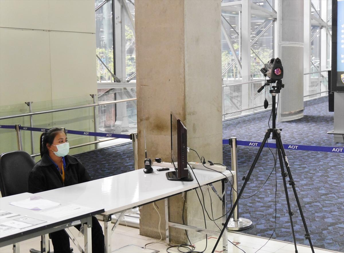 バンコク空港の入国審査官は、全員マスクを着用、入国審査前の通路には、入国者の体温をサーモグラフィーで測定する機器を設置し、警戒を強めている。